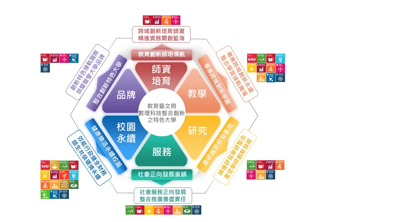 本期校務發展中長程計畫整體涵蓋下列十六項SDGs目標:目標一「消除貧窮」、目標二「消除飢餓」、目標三「良好健康和福祉」、目標四「優質教育」、目標五「性別平等」、目標六「潔淨水與衛生」、目標七「可負擔的潔淨能源」、目標八「尊嚴就業與經濟發展」、目標九「產業創新與基礎設施」、目標十「減少不平等」、目標十一「永續城市與社區」、目標十二「負責任的消費與生產」、目標十三「氣候行動」、目標十五「陸域生命」、目標十六「和平正義與有力的制度」及目標十七「夥伴關係」。