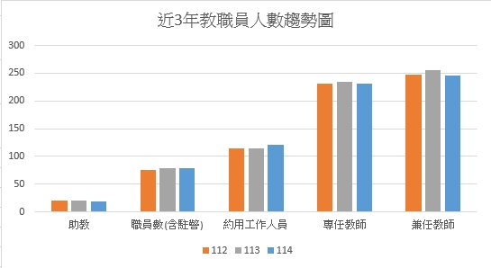 近3學年度教職員人數 https://ntueinfo.ntue.edu.tw/8fd135e746559807754e14eba657882078b8a52d58da852e2 https://ntueinfo.ntue.edu.tw/@@site-logo/logo5.jpg 近3學年度教職員人數 近3學年度教職員人數 學年度 112 113 114 助教 20 20 18 職員數(含駐警) 75 79 78 約用工作人員 115 115 121 專任教師 231 234 232 兼任教師 247 255 246 專任教師不含借調留職停薪人數